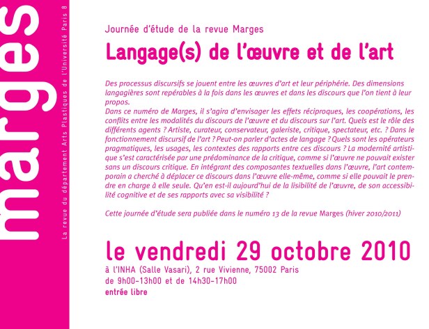 Dans ce numéro de Marges, il s’agira d’envisager les effets réciproques, les coopérations, les conflits entre les modalités du discours de l’œuvre et du discours sur l’art. Quels est le rôle des différents agents ? Artiste, curateur, conservateur, galeriste, critique, spectateur, etc. ? Dans le fonctionnement discursif de l’art ? Peut-on parler d’actes de langage ? Quels sont les opérateurs pragmatiques, les usages, les contextes des rapports entre ces discours ? La modernité artistique s’est caractérisée par une prédominance de la critique, comme si l’œuvre ne pouvait exister sans un discours critique. En intégrant des composantes textuelles dans l’œuvre, l’art contemporain a cherché à déplacer ce discours dans l’œuvre elle-même, comme si elle pouvait le prendre en charge à elle seule. Qu’en est-il aujourd’hui de la lisibilité de l’œuvre, de son accessibilité cognitive et de ses rapports avec sa visibilité ?