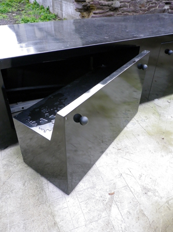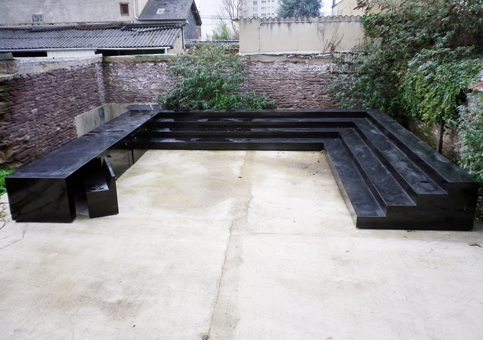 Mais ce qui est surtout marquant est le petit amphithéâtre disposé dans la cour. Il s’agit encore d’un mobilier en U, reprenant l’architecture de présentoir à revue. Deux des faces sont composées de gradins et une troisième d’un plan lice. Ce dernier élément peut se déployer laissant place à des bancs et dégageant la plan pour former une vaste table. La finition en laque noire donne un côté un peu décalé à l’objet installée dans cette cour passablement délabrée (impression renforcée par les flaques d’eau lors de ma visite pluvieuse (Bretagne oblige!), cf photo!).