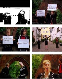 Autre exposition intéressante chez Philippe-Georges et Nathalie Vallois. The Big Society (titre de l’exposition organisée par Alice Motard) propose un tour d’horizon de l’art contestataire britannique des années Tatcher à nos jours. Malgré l’aspect inégal des pièces présentées, la commissaire d’exposition est parvenue à réaliser un accrochage complexe et fluide, chose rare dans une galerie commerciale. Avec ce genre de thématique, le tour de force étant de ne pas tomber dans le « fastoche », c’est-à-dire d’un art politique tendance « gros sabots » qui se situerait quelque part entre un autocollants du Scalp des années 90 et l’animation sociale en milieu défavorisé (plus connu sous le nom de « résidence d’artiste »). Pour être tout à fait honnête, cette tendance est représentée par Ruth Ewan. Mais c’est là qu’on voit qu’on est en présence d’une bonne expo, car mêmes les pièces médiocres servent à accompagner celles qui ont réellement quelque chose à dire comme celles de Peter Kennard ou Nathaniel Mellors. A mon sens, les photocollages de Peter Kennard sont surtout à voir comme des témoignages de la nostalgie des avant-gardes ou comme un genre de graphisme roots (nostalgie du ciseau/colle à l’heure de photoshop). La vidéo de Nathaniel Mellors (MACGOHANSOC, 2005) s’inscrit, quant-à-elle, clairement dans son temps, à la fois radicale et ironique, pointue et mainstream, drôle et intelligente. (à signaler également le petit livret très bien fait pour accompagner l’expo)