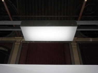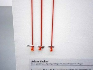 Cela dit, on ne peut rien enlever à la scénographie qui reste particulièrement soignée — hormis ces ficelles dignes du rôti de porc de ma grand-mère . Et si on était mauvaise langue, on pourrait même dire que c’est ce qui est le plus étonnant dans cette présentation. Il suffit de monter les escaliers et de regarder la scène du haut de l’entresol pour s’en rendre compte. On est face à un étonnant jeu géométrique rappelant certains dessins ou plans d’El Lissitzky. Même si on a du mal à comprendre la présence des caissons lumineux comme faux éclairages, l’espace de l’exposition est séduisant ; probablement pas fait pour être parcouru (mais vu de haut!), mais séduisant.