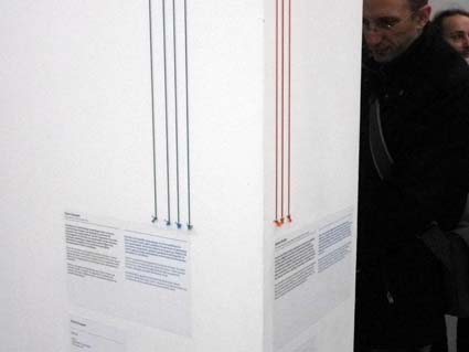 Premier mensonge du commissaire d’exposition « Chaos contre chaos, en pariant que, dans les deux cas, cette discontinuité exacerbée reste cousue par un fil invisible. ». En lieu et place de ce « fil invisible », le visiteur subit un maillage de ficelles (« les grosses ficelles » de l’expo !) comme autant de traces de stabylos sur un livre emprunté à la bibliothèque. L’idée du commissaire d’exposition : réaliser une frise chronologique des dix dernières années agrémentées de coupures de journaux (Le Monde, Paris Match et le Courrier International) le tout reliés à des œuvres (ou plus exactement à leur cartel) par des fils de couleurs. La frise est surlignée par une bande grise qui parcourt l’ensemble des murs extérieurs de l’expo, poursuivant le visiteur jusque dans l’escalier sous forme de toboggan, hélas non expérimentable en tant que toboggan. Mais bon, va pour la frise chronologique — bien qu’un peu lourdingue dans une ambiance coffee table books de France Loisir type la Chronologie du XXe siècle —, mais pourquoi ces ficelles ? Okay, Duchamp avait fait le coup des ficelles en 1942 (Sixteen Miles of Strings), mais c’était pour empêcher le visiteur de voir l’exposition. Et quand Hirshhorn relie ses photocopies avec des tentacules en papier aluminium, il y va carrément (et surtout ne met des œuvres au milieu). Trop timide ou trop présent, ce maillage alourdit largement une scénographie déjà très présente. Desanges à beau mettre en avant l’aspect expérimental de cette astuce de scénographie, mais rien n’y fait. Si tu nous avais demandé, Guillaume, on t’aurait dit :