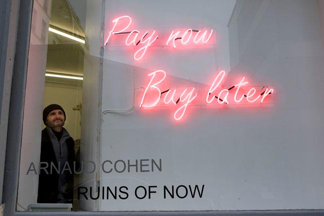 En ressortant de la galerie, je prends le temps de lire les néons : « Tout doit disparaitre », « Pay Now Buy Later », obligé de reconnaitre que ça fonctionne… Arnaud Cohen va nous rendre chèvre !