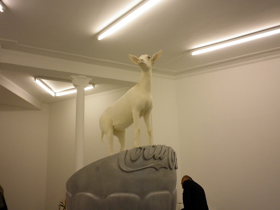 Ça commençait mal : deux néons en vitrine. Je ne sais pour quelle raison mais, ces derniers temps, les néons ont tendance à m’horripiler. Peut-être parce qu’on en voit trop, partout, n’importe comment, et que même les artistes que j’apprécie ont recours à ce bidule luminescent. En plus un néon éteint c’est très moche (en même temps, ça n’a pas vocation à être éteint !). Et si le néon était le wallpainting (ou walldrawing[1]) des années 10. Bref, ça commençait plutôt mal… avant que je ne me trouve nez-à-nez avec une adorable biquette juchée sur une bouteille de coca cola tronquée.
