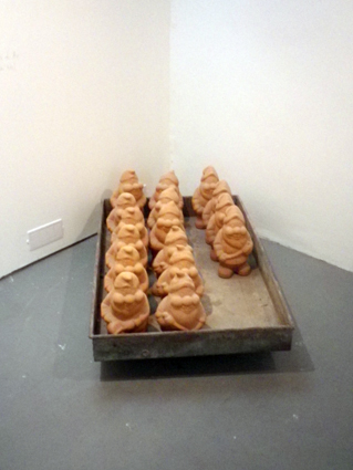 Au sous-sol de la galerie, les vestiges se font plus « terreux » : des pièces de monnaie anciennes, un morceau de statue monumentale, un aspirateur pour fillettes, une armée de nains de jardins ou un mannequin Pamela-Anderson-esque figurant une sorte de Vierge à l’enfant post-nucléaire. Comme à chaque fois, le diable est dans les détails. Par exemple, les pièces de monnaie agencées en smiley proviennent du jardin jouxtant l’atelier de l’artiste. Parmi elles, des pièces datant de Vichy sont positionnées afin de pervertir le message « sympa » des fameux pictogrammes. Idem pour le terrible aspirateur pour fillettes acheté dans un magasin de jouet et disposé sur un socle. Ou encore, l’armée de nains de jardin en terre cuite en provenance directe d’une jardinerie (le code barre en atteste encore) — bien rangée comme il se doit — rappelle l’armée de l’empereur Qin. Et si le seul tombeau possible de notre civilisation était une sorte d’énorme Jardiland ! D’ailleurs, certains films de zombies ne s’y sont pas trompés en transformant le centre commercial en dernier rempart face à la frénésie eschatologique et seule opportunité de survie de l’homme[3].