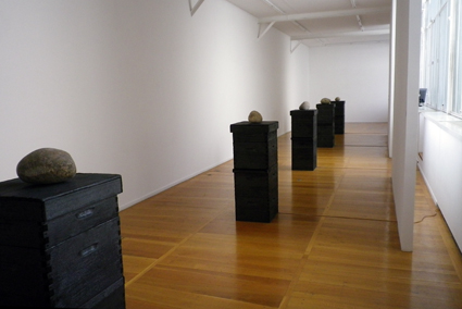 Et on est largement récompensé avec une installation consacrée aux abeilles, leur habitat et surtout le son que tout cela génère (Relais, 2012). Des ruches calcinées surmontées, pour chacune d’un énorme galet, ponctuent l’espace de la galerie en forme d’hommage à la sculpture minimale. Un faible son provient de ces ruches mortes alors transformées en haut-parleurs. A l’autre extrémité de la galerie, on découvre une ruche – celle-ci bien vivante – autour de laquelle des abeilles se livrent à leurs occupations. C’est aussi de cette ruche en activité qu’est enregistré le son qui semblait sortir des ruches calcinées. Une fois de plus, Céleste Bouriser-Mougenot réussit une pièce forte et intelligente non dénuée de poésie. On peut seulement regretter l’autre pièce présentée entre les deux parties de l’installation aux abeilles : le téléphone vintage qui sonne en fonction de l’apparition de certains mots sur internet (U43 2012) parait hélas très convenu au voisinage de Relais.