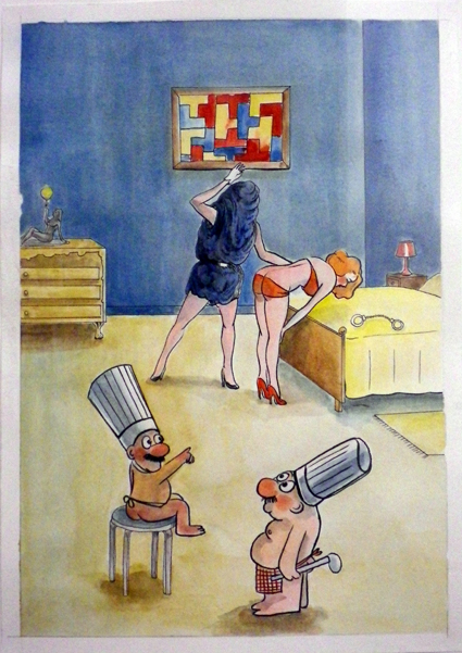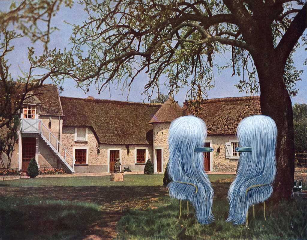 Premier arrêt chez Sémiose qui parvient généralement à présenter des oeuvres formellement à la mode mais proposant toujours quelque chose de différent par rapport à la masse des daubes surgelées qu’on voit chez leurs confrères boxant dans la même catégorie. C’est le cas avec Chambre Rose, Chambre Grise, nouvelle expo d‘Hippolyte Hentgen. Hentgen fait de la retouche de vieilles peintures et d’anciennes photographies pour y adjoindre des petits monstres ou des formes géométriques. L’autre partie de son travail s’attelle à de petites caricatures un peu salaces réalisées dans un style « bad drawing » très en vogue dans les fanzines de dessin contemporain. Au premier abord, on pourrait dire que tout le monde fait un peu ce genre de choses en ce moment, mais Hentgen parvient à tirer son épingle du jeu : davantage de malice dans ses retouches, une sorte de choc des cultures qui ne se borne pas au décoratif (ou à l’ornemental) dans ces peintures figuratives/abstraites, et ses dessins pourris jouent toujours sur une réjouissante ambiguïté.
