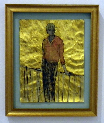 Dans un des autres espaces de la galerie Perrotin (de l’autre côté de l’impasse) sont présentées des oeuvres d’une nullité sans pareil signées Hernan Bas (il ne suffit pas donner un titre ironique pour faire gober n’importe quoi au public!). Sur fond doré, ces portraits de jeunes hommes donneront une conjonctivite foudroyante à tout amateur d’art encore pourvu de rétine organique. Ça ressemble à du mauvais Egon Schiele si cet artiste avait été une sorte de pédé honteux saoudien fasciné par la Rome du film Caligula (je sens qu’avec ce genre de description, je rends ces oeuvres intéressantes, presque malgré moi, aux plus pervers individus de mon fidèle lectorat!). Mais je me dis que cet espace est visiblement dédiés aux trucs les plus moches ramassés par Perrotin et probablement destinés à être vendus à des nababs russes ou à des footballeurs aux gouts approximatifs, férus de voitures « de sport » et autres feuilles d’or dans le champagne. Dommage de présenter de tels fonds de tiroirs, car la peinture de Bas est par ailleurs digne d’intérêt.