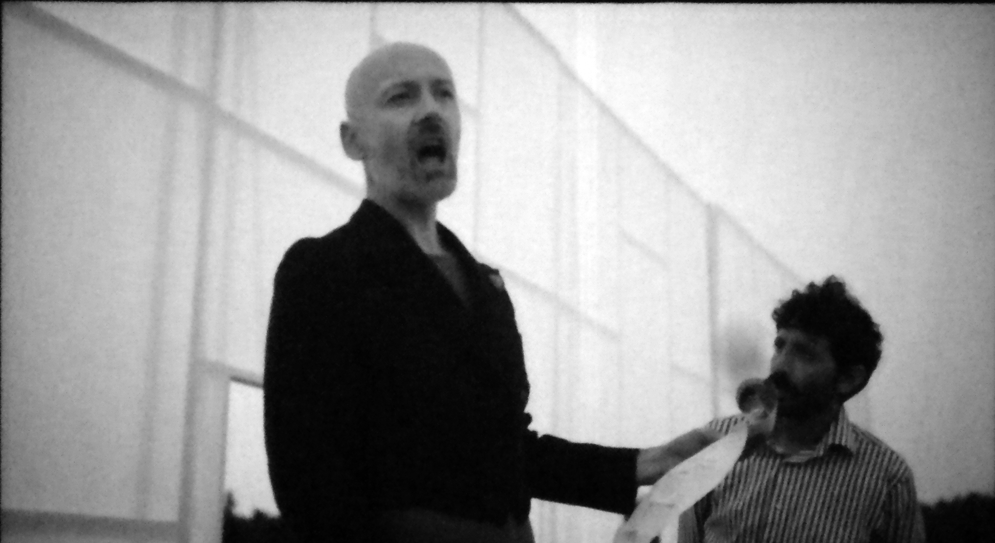 Un homme pénètre dans un couloir délimité par deux pans de tissus ajourés, postés dans une prairie. Il croise divers personnages qui ne semblent pas le voir. Intrigué et curieux, il essaye de communiquer avec eux, sans succès. Les personnages chantent a cappella un texte en allemand dont les intonations ne sont pas sans rappeler Nibelungen de Nico. Vous ne comprenez pas l’allemand, ces chants paraissent des incantations. Au bout d’un certain temps, vous réalisez que les acteurs jouent en playback, élément qui ajoute à l’étrangeté de la scène. La caméra engage un jeu de miroir entre le spectateur et l’homme du film, elle le suit à la trace tout en présentant les différents personnages qui entrent dans le champ sans cohérence apparente entre eux. Au bout des 11 minutes que durent Die Straβe [la rue], un seul désire vous hante : renouveler l’expérience, avec cette étrange sensation qui vous installe dans une incertitude flottante, vous n’arrivez pas à trancher : tenter de comprendre ou se laisser porter…