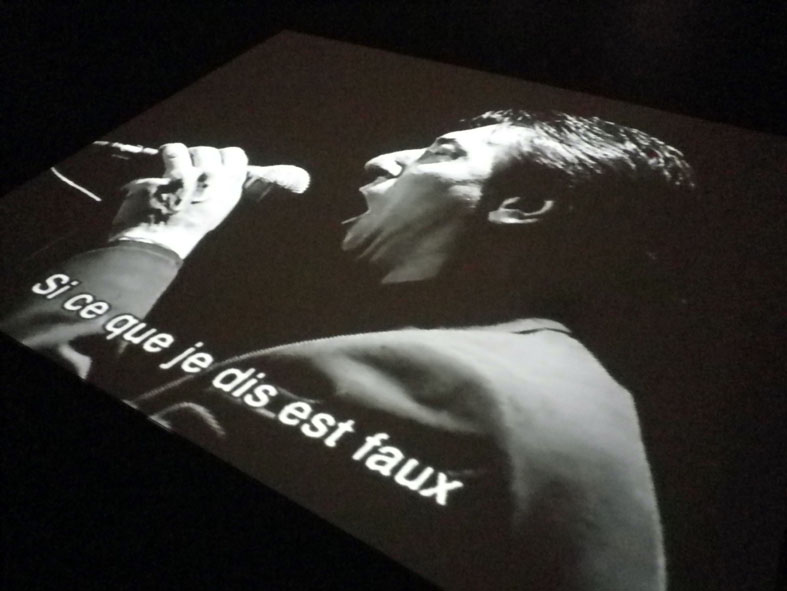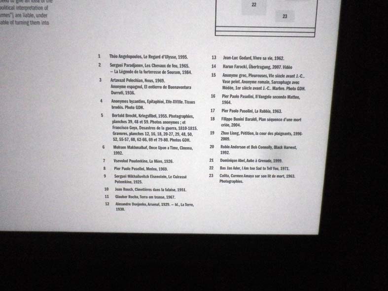 Les extraits de films choisis par Didi-Huberman sont beaucoup plus problématiques. Hormis les liens entre ces différents extraits jamais interrogés (je sais, « c’est le spectateur qui doit faire des liens comme un grand », mais à — mon sens — dès lors qu’on fait exposition, cette idée ne tient plus !), on ne comprend pas non plus les différences de formats entre les différents écrans au sol. Pourquoi des grands, pourquoi des petits ? Pourquoi entend-on le son de certains et d’autres semblent muets ? Certains sont-ils plus importants que les autres ? Autant de supposés partis-pris curatoriaux qui semblent relever essentiellement d’une ambition décorative (par ailleurs plutôt réussie, si on considère une exposition comme un exercice de pure mise en espace…). Alors, évidemment, il y a la figure tutélaire d’Aby Warburg et son Atlas Mnémosyne — dont Didi-Huberman se revendique —, mais n’y a-t-il pas une certaine naïveté à vouloir rejouer les planches de cet Atlas avec des extraits de films ? Le dallage irrégulier donne l’impression que tout ce qu’a compris Didi-Huberman de Warburg est que les images ne sont pas toutes de la même taille (à moins qu’il ne s’agisse de la conclusion qu’on veut qu’en tirent les visiteurs) ! Cette sensation est largement renforcée par l’absence d’explication (« qu’est-ce qu’un Atlas sans une légende ? » me direz-vous), et le texte de Didi-Huberman dans Palais n’en dit pas plus…