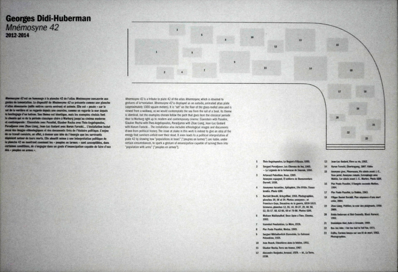 La présence de Mnémosyne ne me paraît pas être réduite à une citation prétexte, mais pose l’enjeu de l’exposition, à la fois formellement et pour ce qui est du fond. La projection de l’atlas (qui glisse donc une fois de plus dans sa nature technique : œuvres d’art —> photographies —> impressions —> vidéo) est dressée formellement comme une stèle, ouvrant sur le champ des dalles d’images horizontales, comme des pierres tombales où gisent la mémoire des images. Comme vous le savez, le paradigme du tombeau est récurrent chez Didi-Huberman.