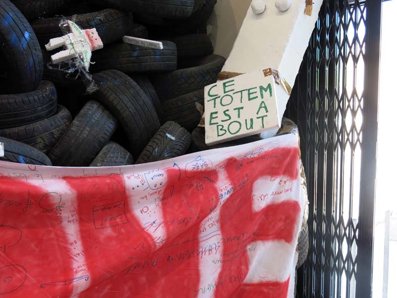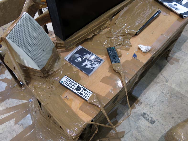 « Flamme Eternelle » occupe une partie du sous-sol du Palais de TokyoHirschhorn organise une sorte de MJC cloisonnée par des murs de pneus. On y trouve des chaises, des fauteuils customisés à la mode Hirschhorn, des pancartes en carton aux textes inachevés et des blocs de polystyrène destinés à être sculptés. Au détour d’un tas de pneus surgissent une bibliothèque et un salon de lecture ; plus loin, une salle informatique où on peut imprimer tout ce qu’on veut. Des banquettes customisées sont disposées devant des écrans équipés de lecteurs dvd où le visiteur est invité à visionner des films ; puis apparait une salle de rédaction où se construit le journal de l’exposition photocopié au jour le jour. Le parcours est ponctué d’agoras au centre desquelles brule une flamme où des écrivains, des philosophes, des musiciens, etc., interviennent. L’artiste revendique le fait qu’il n’y ait aucune programmation communiquée à l’avance, c’est pour lui ce qui fait la différence entre art et animation cultuelle. Je reste pour ma part dubitatif face à cette absence de programme qui semble un moyen pour Hirschhorn d’être le seul à occuper l’affiche. Dans ce dispositif, le bar est central et propose des consommations à des prix imbattables pour le quartier (les cafés à 1 euro et les bières à 2 !). Tout est là pour favoriser « l’être ensemble » cher aux politiques culturelles participatives tellement en vogue. Partout s’affiche la signature visuelle de l’artiste (scotche marron et carton) histoire de rappeler qui est le patron. Bref, typiquement le genre d’exposition pastorale (au sens théologique du terme !) que j’ai tendance à fuir.