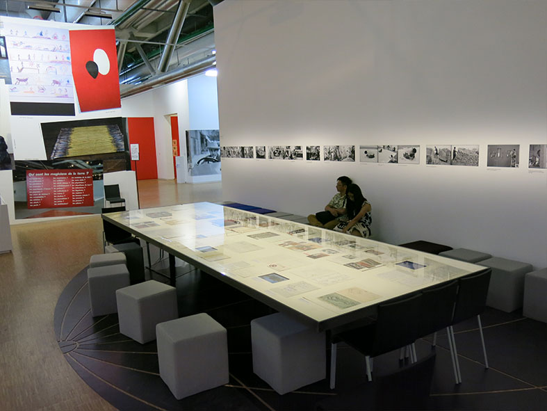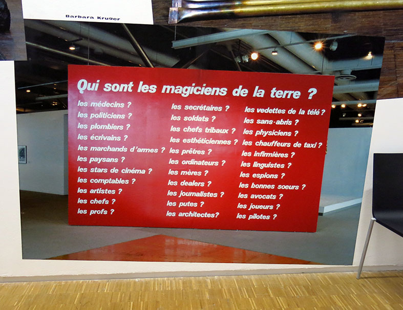 L’institution, enlisée dans une politique idiote de branding (transformer le Centre en « marque » destinée à l’export) — et donc de marche forcée vers les blockbuster— ne propose depuis quelques années que des expositions monographiques peu risquées et des accrochages insipides. Cette politique s’opère au détriment d’expositions collectives innovantes interrogeant une notion ou un air du temps comme cela avait pu être le cas — il est vrai avec des fortunes diverses — auparavant. Suivant cette pente boueuse, Beaubourg fait dans le vintage. Il ressort les Must : à savoir une exposition culte dont tout le monde parle, mais que la plupart des commentateurs n’ont jamais pu expérimenter autrement que comme mythe[4], étant trop jeunes pour l’avoir vue « en vrai ». Seulement, au lieu d’interroger le concept des « Magiciens » avec des artistes actuels, le Centre construit un mausolée lourdingue et pompeux à sa propre gloire (au passage, c’est dire la considération que cette institution a pour l’art actuel !). Formellement, c’est une sorte de patchwork mal ficelé de prises de vue l’expo de 1989 et de vitrines montrant des brochures et des documents d’époque. Les posters grands formats sont collés à même le mur et disposés un peu de travers pour l’aspect chambre d’ado (histoire que le visiteur comprenne que même si c’est bien rangé, il est chez d’authentiques rebelles) ! Une grande table est disposée au milieu de l’espace pour accueillir des éloges funèbres des conférences… Bref, on dirait du Hirschhorn sans la bière pas chère ni les bouquins, ce qui perd évidemment tout son intérêt ! Le point d’orgue de cette escroquerie curatoriale est le catalogue d’exposition vendu 69,50 euros ce qui en fait probablement le catalogue le plus cher du Centre Pompidou ! Donc, une exposition rance, réchauffée, morte née et inutile à tous points de vue.