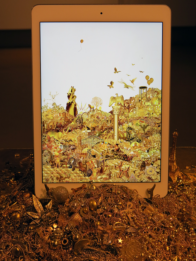« Le voila mon coin à brimbelles ! », la fameuse petite clairière. Mais elle n’est pas exactement comme la dernière fois : un étrange objet trône au centre (Emilie Brout et Maxime Marion). Petit Poucet s’approche prudemment, il est habitué aux entourloupes magiques des forêts enchantées. Ça brille, ça brille vraiment beaucoup. Petit Poucet s’approche encore, il trépigne devant ce trésor merveilleux, il estime déjà les brouettes remplies d’or que cela représente. « Plus besoin d’aller aux brimbelles » pense-t-il. Mais qu’est-ce donc au centre, un monolithe étrange, lumineux, rutilant, séduisant. Il s’approche, il s’approche encore, il s’approche, il s’approche,… »