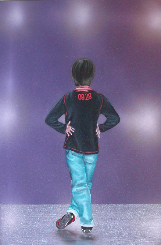 Et s’il n’était question que de scène, une sorte de théâtre où les acteurs viennent faire leur salut avant de disparaître dans les coulisses, de retourner à la « vie normale ». C’est cette histoire que semble raconter LPJP04 où un homme fait face à un plan composé de ce qui ressemble à des spots. Mais le regardeur est sur scène, avec lui ou dans les coulisses, ébloui par cette lumière qui empêche de voir le public : cet autre devenu masse, noyé dans ces halos lumineux et renvoyé à son anonymat. Ces halos forment un motif presque pop, contrastant avec d’autres fonds plus oppressants. Ailleurs, un enfant pose débonnaire comme seuls les enfants savent l’être (OM05). Il porte un jean, des baskets et un sweat noir au dos duquel figure un numéro. Devant lui, un fond violet est entrecoupé de halos réguliers. Le sol est quant à lui presque constellé de paillettes. Le garçon doit avoir une dizaine d’années et adopte une pose de défi. Mains sur les hanches, paumes ouvertes vers le regardeur, sa jambe droite vient croiser la gauche comme pour signer un délicat bras d’honneur. Il se joue de tout, de l’exercice de la pose, de la patience du peintre et de la curiosité du regardeur. Il est sur scène et il le sait, contrairement aux adultes amnésiques ayant pris l’habitude de ce jeu.