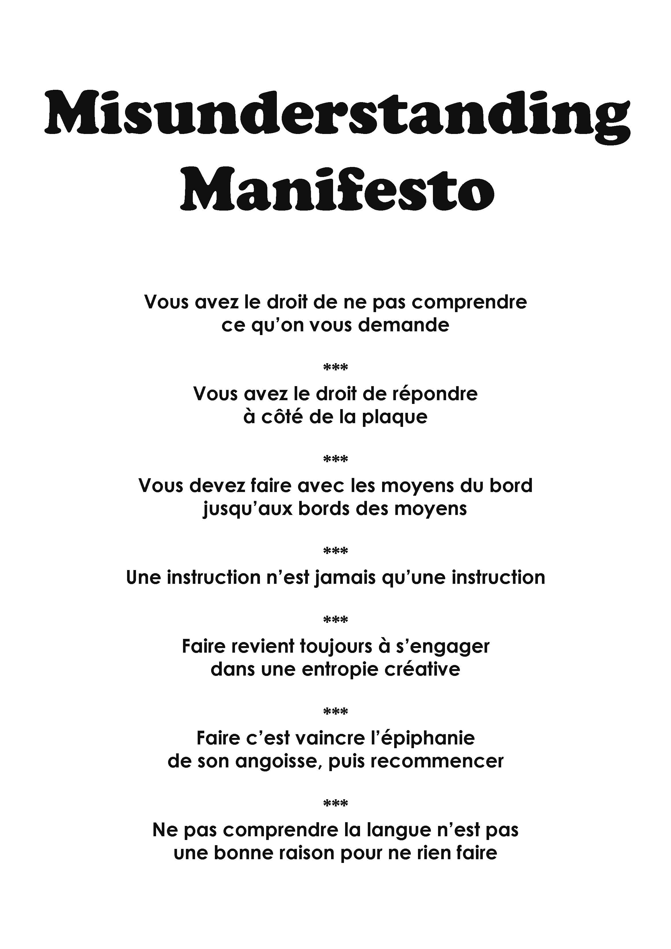 L’exposition Misunderstanding s’appuie sur cette mécompréhension créative et embrasse l’ensemble des enjeux évoqués précédemment. Ici, deux groupes d’étudiants issus de contextes culturels différents (l’un en France, l’autre en Angleterre) s’échangent des protocoles de production d’œuvre. Chacun va donc comprendre les consignes qui lui sont envoyées selon les présupposés de sa culture et ses accointances plastiques. Au delà du simple jeu, ce dispositif renvoie également à la double situation politique de ces dernières années, à savoir les contraintes de déplacement et de communication décidées par les États en raison la crise sanitaire et les contrainte de circulation imposées par le Brexit. Dans ce contexte, il a été nécessaire de mettre en place des moyens de circulation des idées et de collaborations inédites. Misunderstanding est un acte de résistance ludique et peu être même luddite8 dans le sens où il s’agit de détruire une machine étatique et administrative devenue néfaste pour la création. C’est aussi cela qu’entend mettre en scène Misunderstanding.