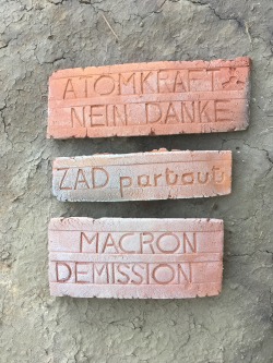 L. T. — De plus en plus, je fabrique des objets avec ce type de questionnement. Mais ces objets sont aussi des outils : ils possèdent une valeur d’usage, comme l’usine à briques de Monbalen. J’ai aussi fabriqué un outil de typographie, une « marguerite » (Marguerites, buis et bois de cerf, mai 2020). Ce sont des pièces de bois que j’ai sculptées pour avoir un petit côté, un grand côté, un côté moyen, un petit arc de cercle et un grand arc de cercle ; qui servent à tracer toutes les lettres de l’alphabet. J’ai donc créé une typographie qui fonctionne avec cet objet unique. La marguerite est née parce que je cherchais un moyen sommaire d’inscrire des mots sur de l’argile.
